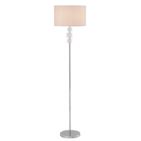 The Ester floor lamp has a chrome metal base with clear glass accents and a grey faux silk shade. Complete with a 150cm clear PVC cord with cordline switch.