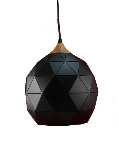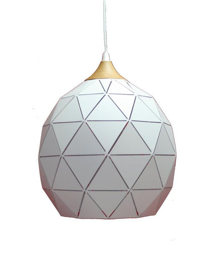 Spherical pendant lights with triangular cutouts, topped off with a wooden detail. Available in three sizes and in black or white.