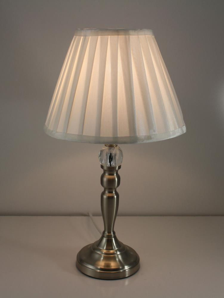 Victoria touch lamp available in antique brass base with gold shade, polished chrome base with white shade or satin nickel base with cream shade.